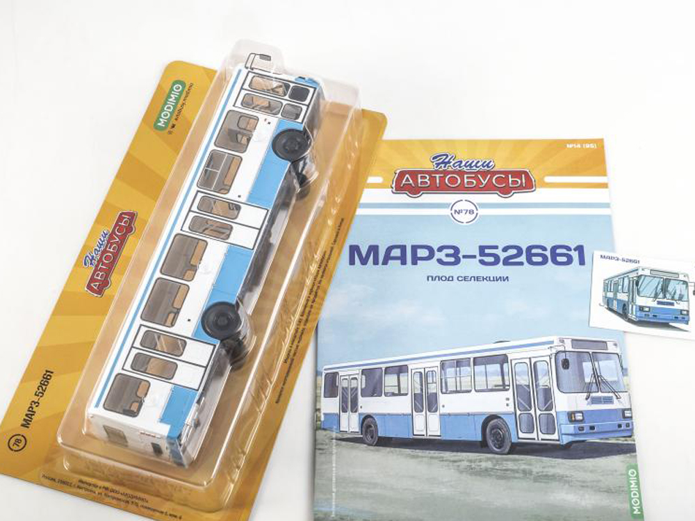 Журнал с вложением МАрЗ-52661 - Плод селекции, белый с синим в масштабе 1/43. Журнал выпущен ограниченным тиражом. Производитель - Наши Автобусы. Примерный размер модели автомобиля в масштабе 1/43 составляет около 9-12 см в длину для легкового автомобиля. Для грузовиков, автобусов, мотоциклов и другой техники точные размеры модели можно получить путем деления размеров прототипа на масштаб.
